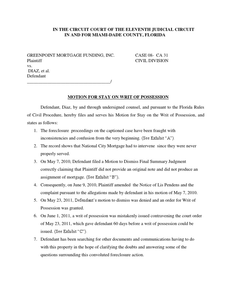Motion Stay Writ of Possession 1 Motion In United States Law Defendant