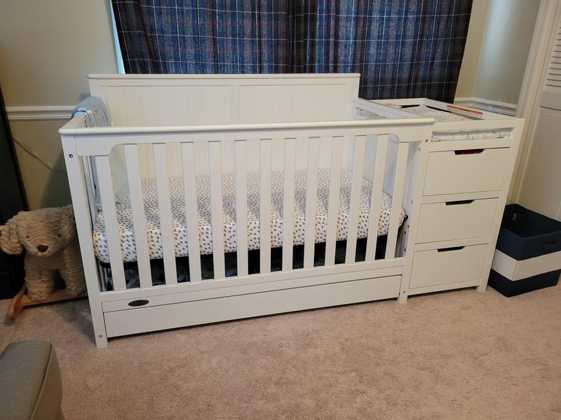 A spacious drawer at the base. Finish off your little one's nursery with this convertible crib and changer from graco. Attached changing table with change pad. Hello, thanks for reaching out. This question was asked about the related product: