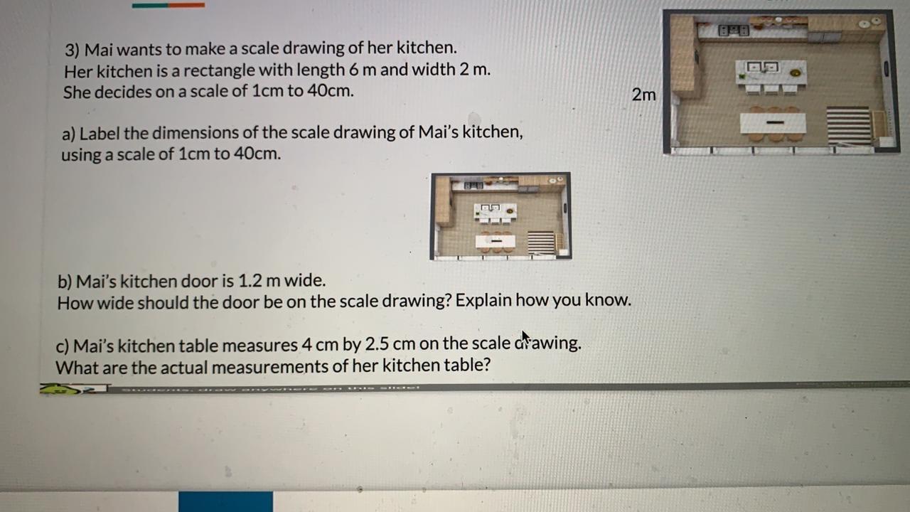Her kitchen is a rectangle with length 6 m and width 2 m. Mai wants to make a scale drawing of her kitchen. Her kitchen is a rectangle with a length of 6 m. Her kitchen is a rectangle with length 6 m and width 2. Mai’s kitchen door is 1.2 m.
