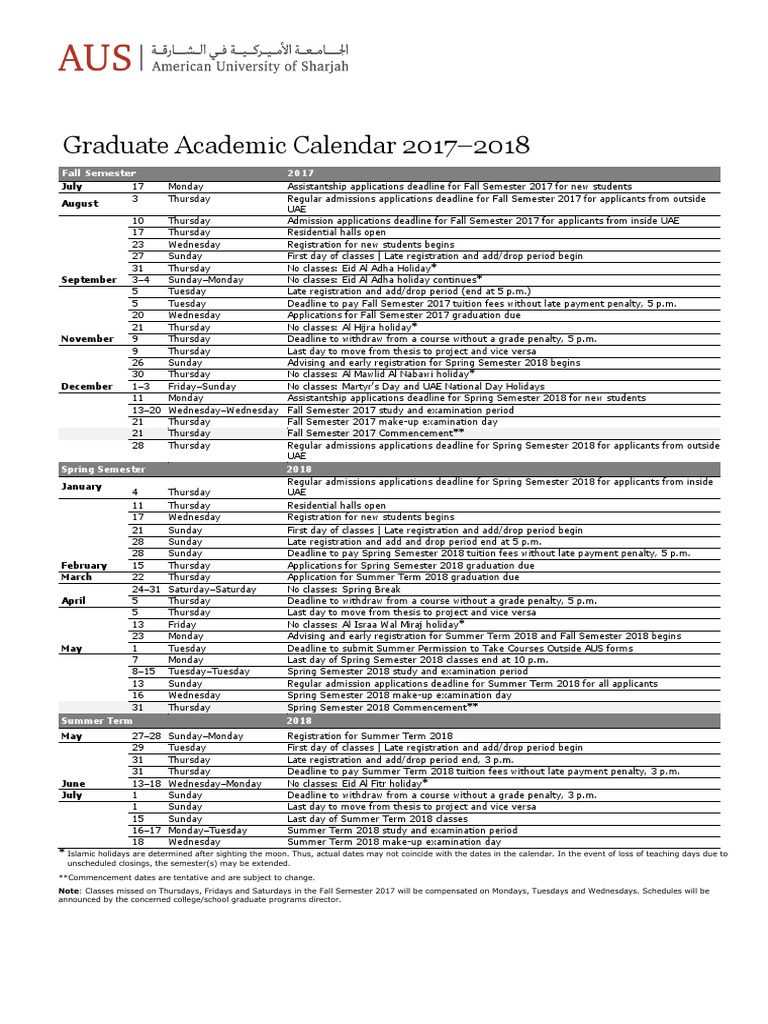 Graduate Calendar 2017 2018 PDF Academic Term Educational