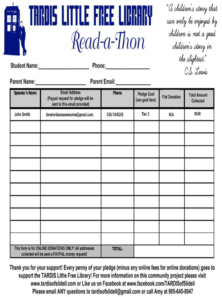 Read a Thon Pledge Form Online Donation Form